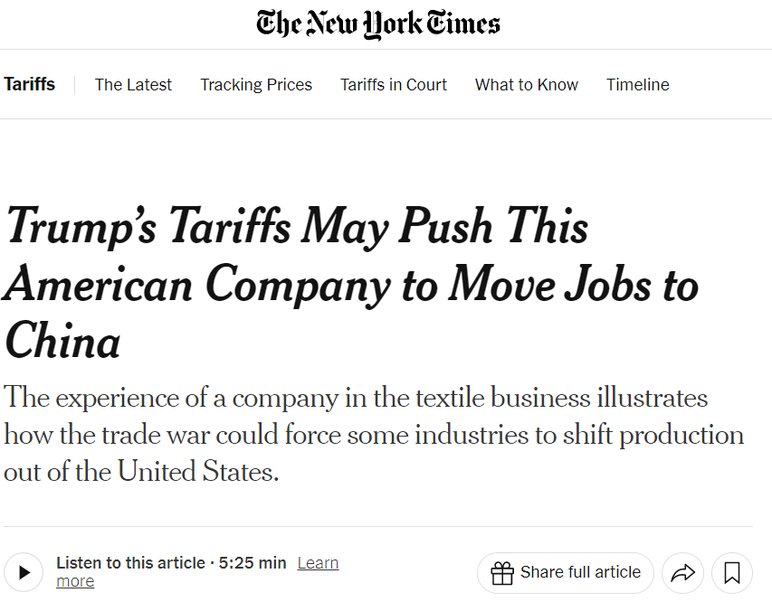 文章說,特朗普政府發(fā)起的全球貿(mào)易戰(zhàn)動搖了Cocona Labs公司的經(jīng)濟(jì)基礎(chǔ)。受到美國關(guān)稅不確定性的影響,加之中國實(shí)施的對等反制措施,這家美國公司將開始做出改變:將其核心產(chǎn)品的部分生產(chǎn)從美國轉(zhuǎn)移到中國的工廠生產(chǎn)。