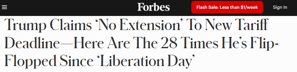 對于此次關稅調整,《福布斯》雜志網站7日報道指出,從今年2月7日首次公開提及對他國進口商品征收全面關稅,到強調“2025年8月1日這一日期不會有任何延長”的這五個月里,特朗普政府在關稅問題上的態(tài)度“翻轉”了大約28次。