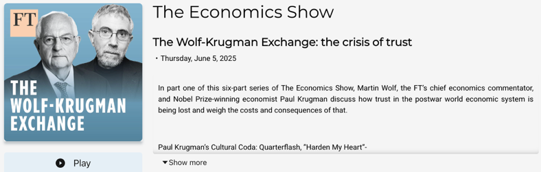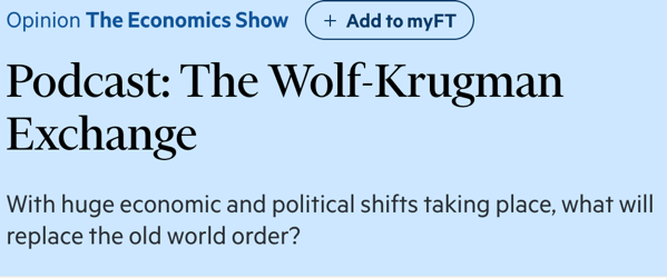 從制度經(jīng)濟(jì)體滑向“尋租國家”? 這次訪談中,克魯格曼提出一個(gè)判斷:如果關(guān)稅政策工具繼續(xù)被武器化,美國將愈發(fā)像一個(gè)“尋租型國家”(rent-seeking state),即決策權(quán)不再由制度和法治約束,而成為政治集團(tuán)或個(gè)人謀取短期利益的手段。 “在某種意義上,特朗普的關(guān)稅政策展示了他眼中‘總統(tǒng)權(quán)力’的極限邊界——不是去調(diào)和利益,而是用威脅制造服從?!笨唆敻衤硎?,這種做法讓他想起一些治理脆弱國家的“強(qiáng)人統(tǒng)治”模式。 △克魯格曼在第三期節(jié)目“不確定世界中的經(jīng)濟(jì)”中,對“關(guān)稅武器化”、制度可預(yù)測性喪失、通脹與成本轉(zhuǎn)嫁等進(jìn)行了集中的尖銳批評 克魯格曼進(jìn)一步表示,正是這種任意性極強(qiáng)的行政權(quán)使用方式,正在導(dǎo)致“制度信任的崩塌”,不僅損害了美國在全球經(jīng)濟(jì)治理中的正當(dāng)性,也動(dòng)搖了其作為“安全資產(chǎn)提供者”的地位??唆敻衤f:“你不能一方面要求全球資金繼續(xù)信任美元、美國國債,一方面又在國內(nèi)政治與國際政策上大搞不確定性。” 關(guān)稅邏輯背后的“美國優(yōu)先”困境 克魯格曼強(qiáng)調(diào),特朗普對關(guān)稅的使用并非源自嚴(yán)謹(jǐn)?shù)漠a(chǎn)業(yè)保護(hù)主義邏輯,而是一種民族主義情緒的表達(dá)工具,是其“美國優(yōu)先”政策的直接延伸。 △《金融時(shí)報(bào)》在對完整六期訪談的總結(jié)報(bào)道中,深入總結(jié)了克魯格曼與沃爾夫兩人對當(dāng)前制度退化、全球治理、選民心理的批評視角 他分析稱,這種情緒政治化的關(guān)稅政策雖然短期內(nèi)可帶來選舉紅利,但長期來看,其實(shí)際經(jīng)濟(jì)收益微乎其微,甚至可能引發(fā)全球供應(yīng)鏈脫鉤和美國制造業(yè)成本上升。 克魯格曼警告說:“關(guān)稅從來都不是孤立存在的,它必然引發(fā)連鎖反應(yīng)。而這種反應(yīng)的最大受害者,往往是本國消費(fèi)者與小企業(yè)?!?/p>