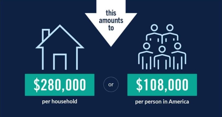彼得森基金會給出驚人結(jié)果:如果將債務分攤給美國民眾,相當于每戶家庭負債28萬美元,每個人負債10.8萬美元。