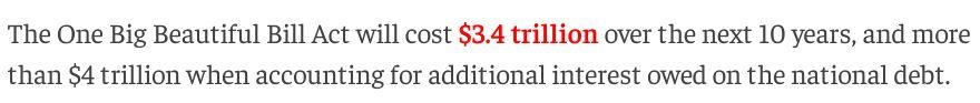 根據(jù)美國國會預算辦公室(CBO)上月做出的評估,“大而美”法案預計將在未來十年使美聯(lián)邦政府財政赤字增加約3.4萬億美元;如果算上同期的額外美債利息,新增赤字更是將超過4萬億美元。
