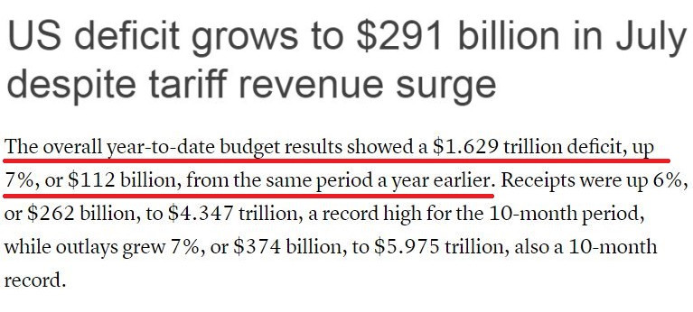 而從本財年(2024年10月1日至2025年9月30日)的整體情況來看,在截至7月的前十個月,美政府累計財政赤字已達1.63萬億美元,同比增長了7%。