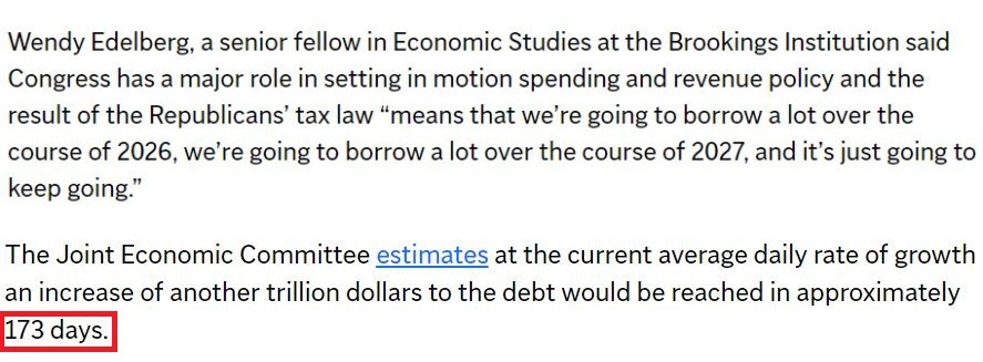 據(jù)美國國會聯(lián)合經(jīng)濟委員會估計,按照目前的日均增長速度,美債總額將在大約173天內(nèi)再增加1萬億美元。