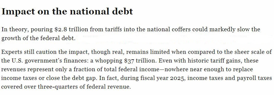 雖然美國政府確實從其濫施的關稅中“賺”了一筆,但專家們?nèi)匀痪嬷赋?,與37萬億美元的龐大美債規(guī)模相比,關稅收入實屬九牛一毛。即使加上歷史上的關稅收益,它們也只占聯(lián)邦總收入的一小部分,遠不足以取代所得稅或縮小債務缺口。