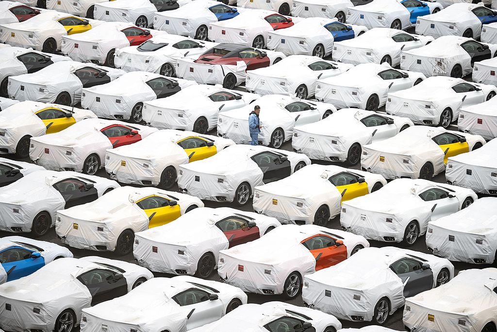 當(dāng)?shù)貢r(shí)間2025年4月11日,日本橫濱大黑碼頭,停放著新車。