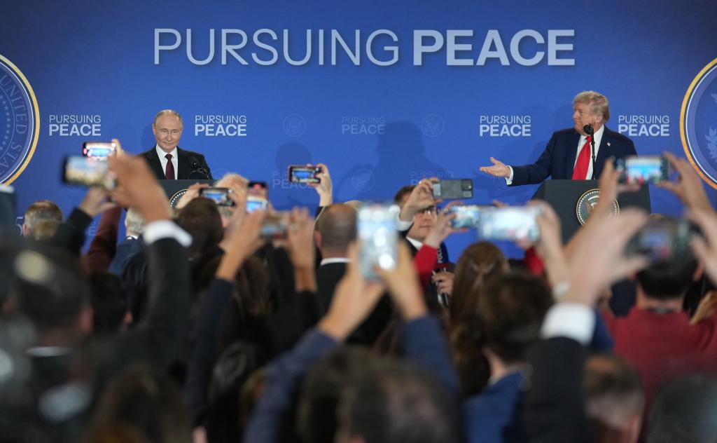8月15日,美國(guó)總統(tǒng)特朗普(右)與俄羅斯總統(tǒng)普京在美國(guó)阿拉斯加州安克雷奇市埃爾門多夫-理查森聯(lián)合軍事基地舉行會(huì)晤后共同出席聯(lián)合記者會(huì)。新華社記者吳曉凌攝