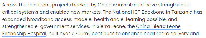 文章說,中國在非洲投資支持的項目夯實了關鍵系統(tǒng)根基,催生了新興市場。文章舉例說,坦桑尼亞的國家信息通信技術寬帶骨干網項目顯著拓寬了寬帶覆蓋范圍,讓線上醫(yī)療和線上學習成為可能,并強化了電子政務服務體系;塞拉利昂的中塞友好醫(yī)院持續(xù)提升當地的醫(yī)療服務水平,在抗擊埃博拉疫情期間發(fā)揮了關鍵作用……文章說,這些項目的故事或許不會成為西方媒體的頭條新聞,但它們實實在在提振了市場,培養(yǎng)了勞動技能,為非洲企業(yè)的蓬勃發(fā)展創(chuàng)造了條件。