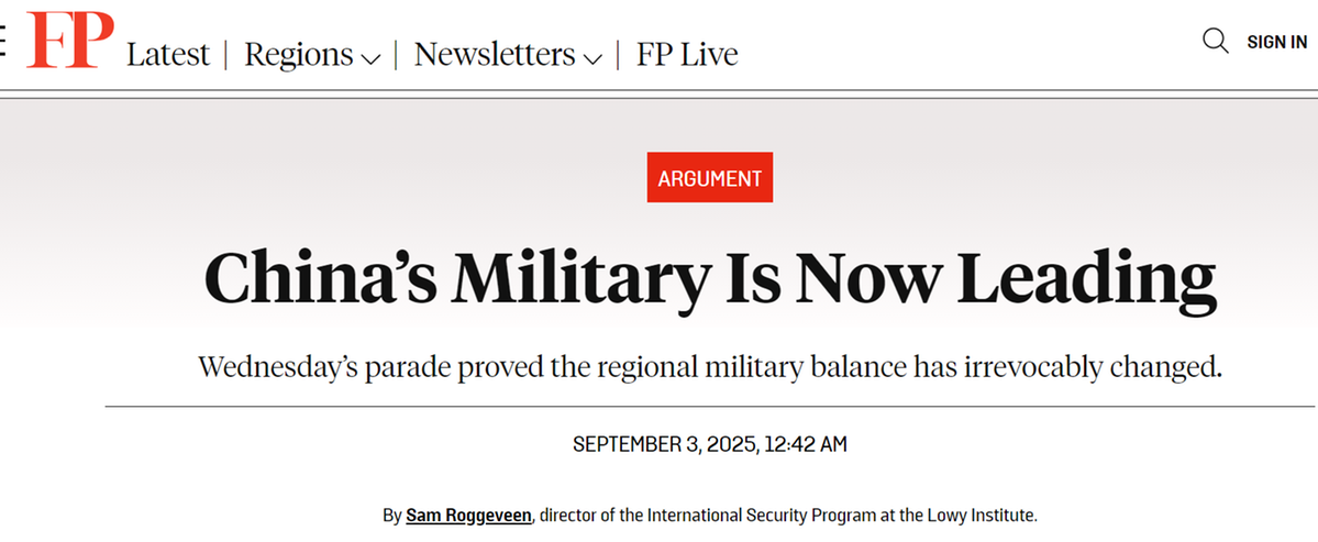 洛伊研究所國際安全項目主任薩姆·羅格維恩在美國《外交政策》網(wǎng)站撰文稱,西方的軍事規(guī)劃人員會對閱兵式上展出的裝備感到驚訝,已經(jīng)不能再說中國軍隊在迎頭趕上,或者所謂“抄襲”外國軍事裝備設(shè)計,“中國軍備正在創(chuàng)新,并且處于領(lǐng)先地位”。