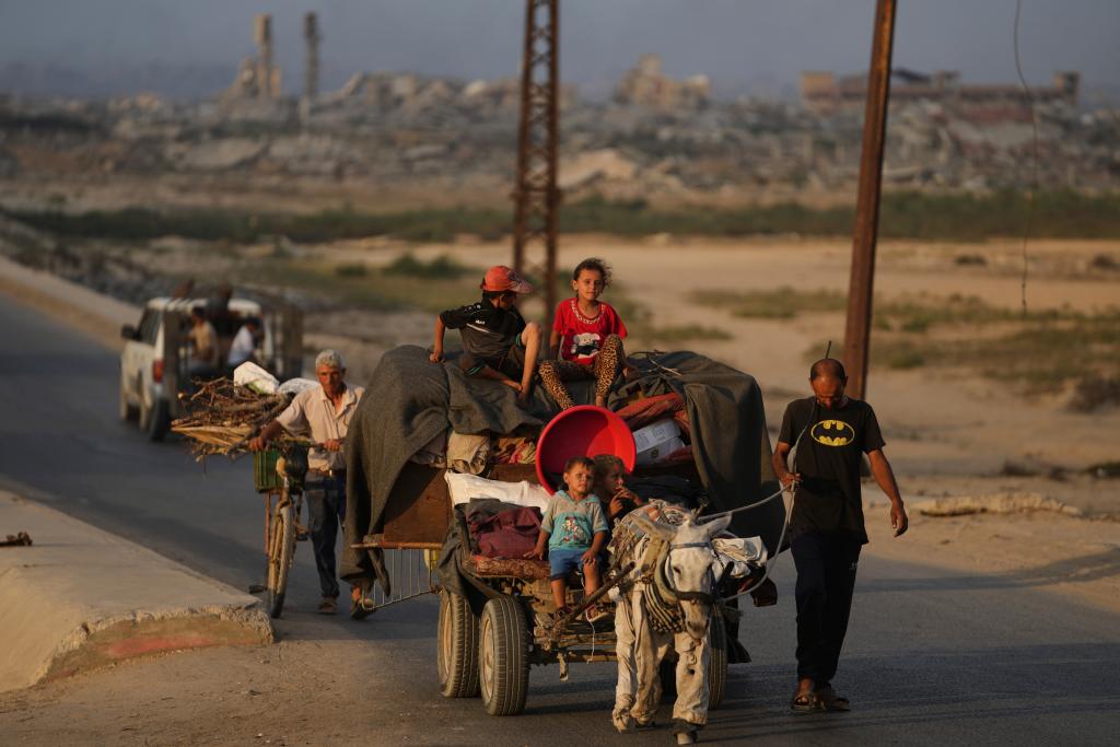 9月6日,巴勒斯坦人攜帶家當(dāng)從加沙地帶北部撤離,前往南部。新華社/美聯(lián)