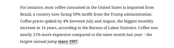 對于漲價(jià),美國消費(fèi)市場的現(xiàn)實(shí)數(shù)據(jù)中已有所體現(xiàn):受對巴西征收50%關(guān)稅影響,咖啡價(jià)格在7月至8月間飆升4%,創(chuàng)14年來最大月度漲幅;對墨西哥西紅柿征收17%關(guān)稅后,8月美國西紅柿價(jià)格漲幅達(dá)4%。
