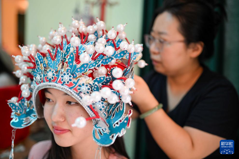 9月18日,在吉爾吉斯斯坦奧什國立大學(xué)孔子學(xué)院,一名教師為學(xué)生佩戴晚會(huì)活動(dòng)上用的頭冠。新華社記者 李任滋 攝