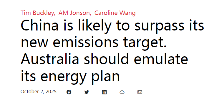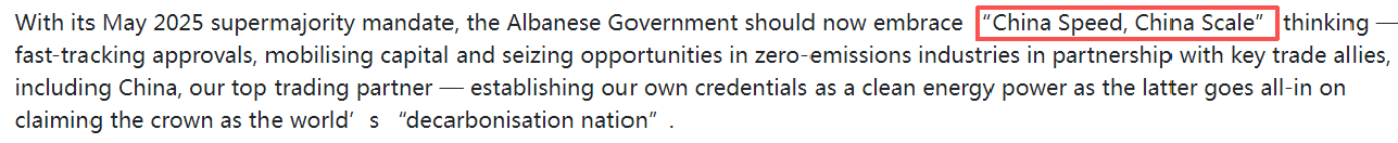 文章說,澳大利亞政府近期也公布了2035年減排目標。澳大利亞能源部長克里斯·鮑文推出的35億澳元“家庭電池補貼計劃”已安裝超6萬套儲能系統(tǒng),證明政策驅(qū)動的轉(zhuǎn)型潛力。分析認為,澳大利亞政府應借鑒“中國速度”,加快審批流程、撬動民營資本,并在零碳產(chǎn)業(yè)領(lǐng)域深化與最大貿(mào)易伙伴——中國的合作,以確立澳大利亞在清潔能源領(lǐng)域的競爭力。