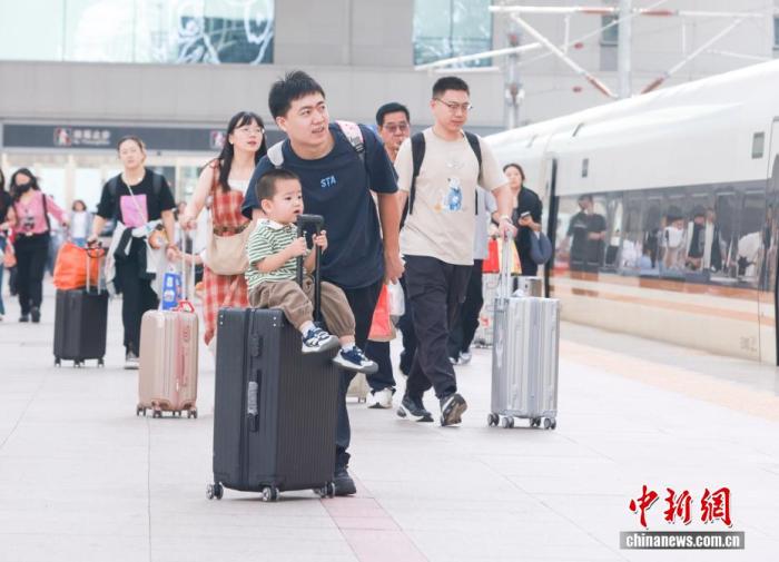 10月1日,國慶中秋假期首日,家長帶著孩子在北京北站乘車。當日,中國鐵路迎來國慶中秋假期客流最高峰,預計發(fā)送旅客2300萬人次,計劃加開旅客列車2106列。中新社記者賈天勇攝