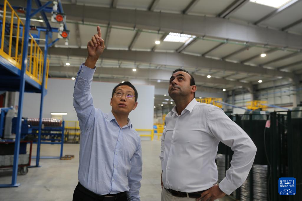 10月3日,在葡萄牙北部奧瓦爾市,亨通集團(tuán)駐葡萄牙的設(shè)備經(jīng)理劉建龍(左)與阿爾科夫雷電纜廠首席運(yùn)營(yíng)官卡洛斯·格蘭雅討論技術(shù)問(wèn)題。新華社記者荀偉攝
