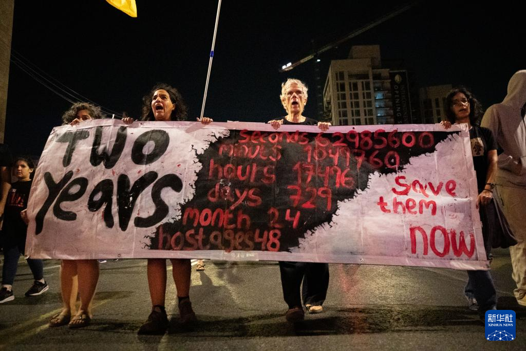10月4日,人們在耶路撒冷參加游行集會(huì),要求政府迅速在加沙地帶實(shí)現(xiàn)?;稹P氯A社記者 陳君清 攝