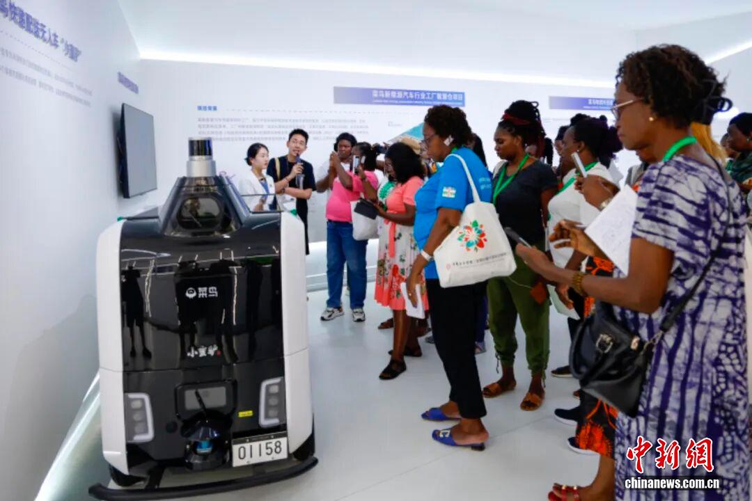 2025年9月16日,中非婦女官員能力建設(shè)研修班的25名學(xué)員來(lái)到杭州的中國(guó)人工智能小鎮(zhèn)。圖為研修班成員參觀快遞配送無(wú)人車。 中新社記者 肖健 攝