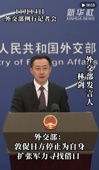 新華社北京11月14日電(記者董雪、劉楊)外交部發(fā)言人林劍11月14日表示,中方對日方近期軍事安全動向感到嚴重關(guān)切,敦促日方停止為自身擴張軍力尋找借口。