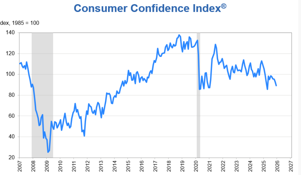 世界大型企業(yè)研究會首席經濟學家達娜·彼得森表示,盡管11月的數(shù)據因聯(lián)邦政府“停擺”結束而被向上修正,12月消費者信心再次下滑并依然遠低于今年1月的峰值。消費者信心指數(shù)5個成分指數(shù)中有4個出現(xiàn)下降,另一個表現(xiàn)明顯疲弱。