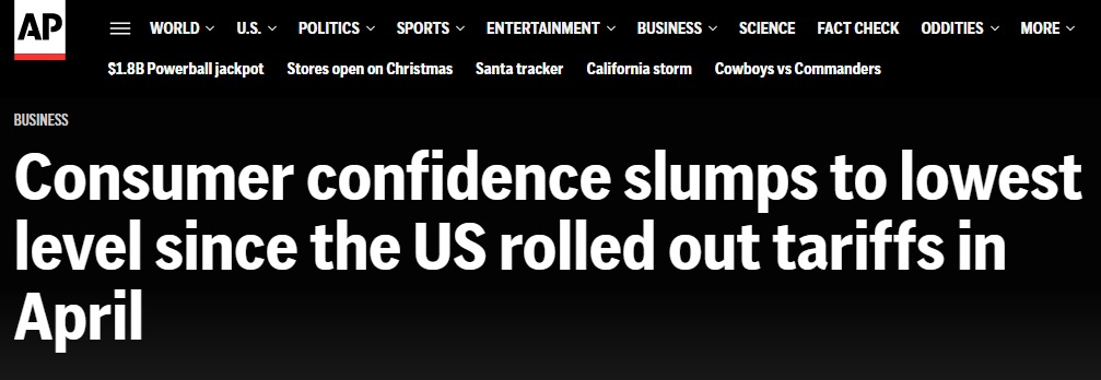 報(bào)道稱,根據(jù)調(diào)查給出的書面回復(fù),盡管美國(guó)政府一再聲稱通脹是騙局,但物價(jià)上漲和通脹加劇,連同關(guān)稅問(wèn)題,仍然是消費(fèi)者最大的擔(dān)憂。美國(guó)消費(fèi)者對(duì)當(dāng)前經(jīng)濟(jì)狀況的評(píng)估暴跌9.5點(diǎn)至116.8。