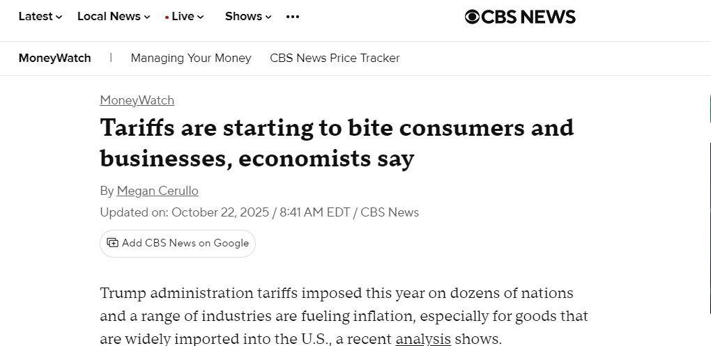 哥倫比亞廣播公司(CBS)新聞網(wǎng)今年10月的報(bào)道也指出,美國(guó)政府實(shí)施的關(guān)稅開始“咬噬”消費(fèi)者和企業(yè)。經(jīng)濟(jì)學(xué)家指出,關(guān)稅正在推高通脹,尤其是對(duì)大量進(jìn)口的商品而言。進(jìn)口商通常會(huì)將部分關(guān)稅成本轉(zhuǎn)嫁給消費(fèi)者。今年關(guān)稅預(yù)計(jì)將給美國(guó)企業(yè)額外增加1.2萬億美元成本,其中大部分由消費(fèi)者承擔(dān)。