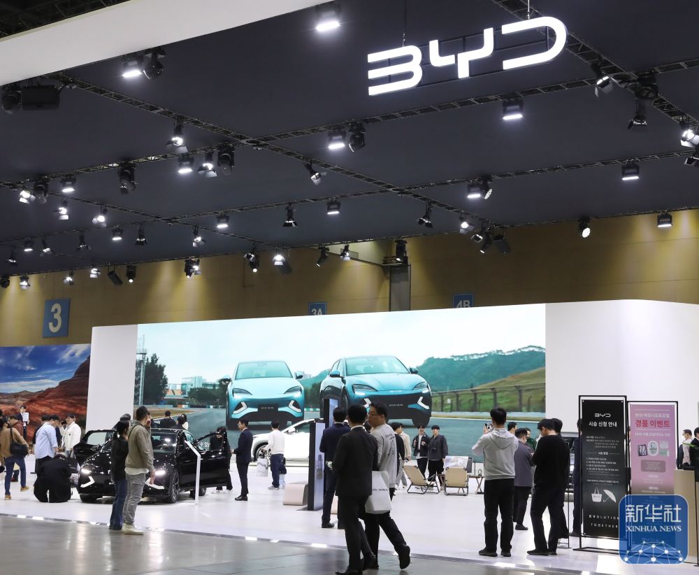 2025年4月8日,在韓國高陽舉行的 “2025首爾移動出行展”上,觀眾參觀中國品牌比亞迪展區(qū)。