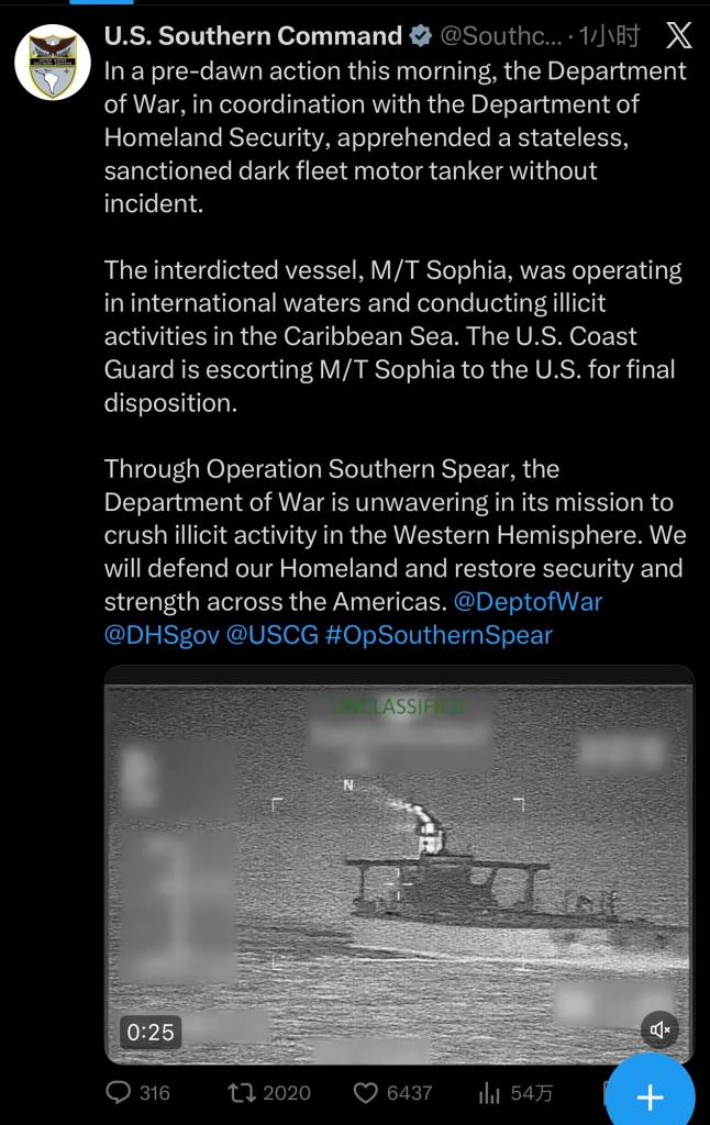 此外,美國南方司令部7日在社交媒體發(fā)布消息稱,美國當(dāng)天凌晨攔截“一艘無國籍、受制裁的‘影子艦隊’油輪”,行動過程中未發(fā)生任何意外。該船名為“索菲亞”號,當(dāng)時正在國際水域航行。美國海岸警衛(wèi)隊正在控制“索菲亞”號前往美國進(jìn)行處置。據(jù)路透社消息,這艘船1月早些時候從委內(nèi)瑞拉駛離。(記者:馬驍、湯潔峰)
