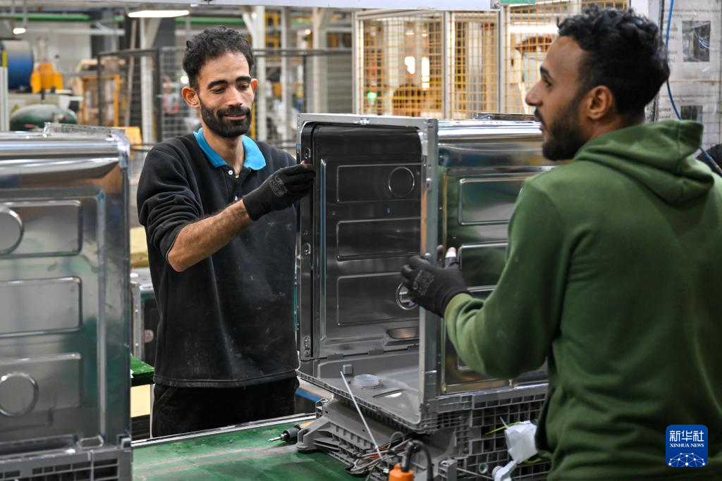 1月19日,在埃及蘇赫奈泉的中?!ぬ┻_(dá)蘇伊士經(jīng)貿(mào)合作區(qū),埃及員工在美的埃及廚房和熱水器有限公司洗碗機(jī)生產(chǎn)車間組裝洗碗機(jī)。新華社記者 辛夢晨 攝