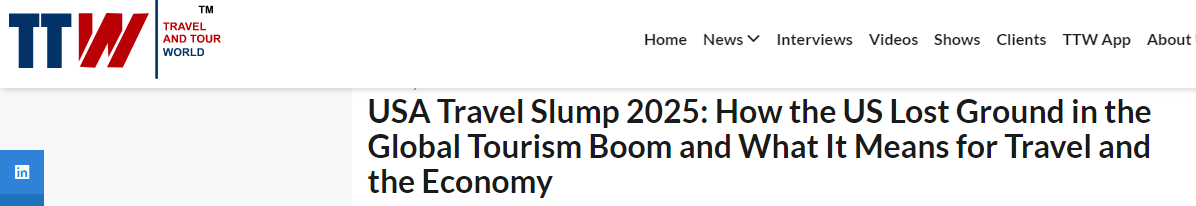 國際旅游行業(yè)媒體《旅行與旅游世界》網(wǎng)站也在報道中提到,美國旅游業(yè)2025年呈現(xiàn)出了與全球旅游業(yè)蓬勃發(fā)展截然相反的態(tài)勢——入境游客數(shù)量減少、旅游消費(fèi)額下滑,這一局面給美國旅游行業(yè)乃至整體經(jīng)濟(jì)帶來巨大沖擊。