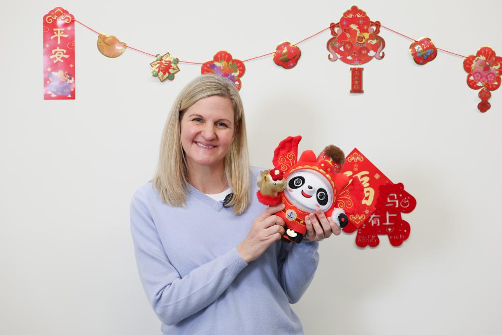 手持一只馬年限定版的“冰墩墩”