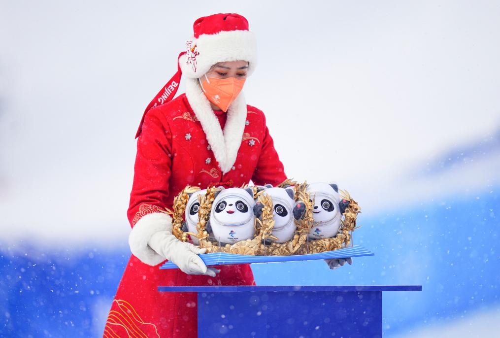 2022年2月12日,北京冬奧會(huì)紀(jì)念品頒發(fā)儀式工作人員擺放“冰墩墩”紀(jì)念品。新華社記者 許暢 攝