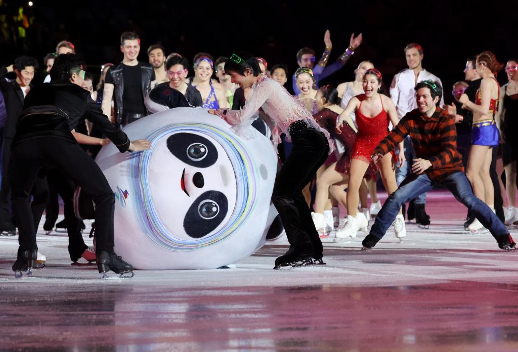 2022年2月20日,北京冬奧會(huì)花樣滑冰表演滑舉行,“冰墩墩”不小心摔倒后,選手們紛紛上前幫忙。新華社記者 張玉薇 攝