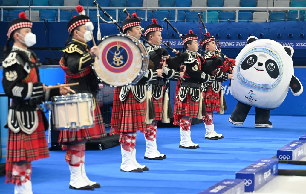 2022年2月19日,“冰墩墩”在北京冬奧會(huì)男子冰壺金牌賽開(kāi)賽前熱場(chǎng)助興。新華社記者 李賀 攝