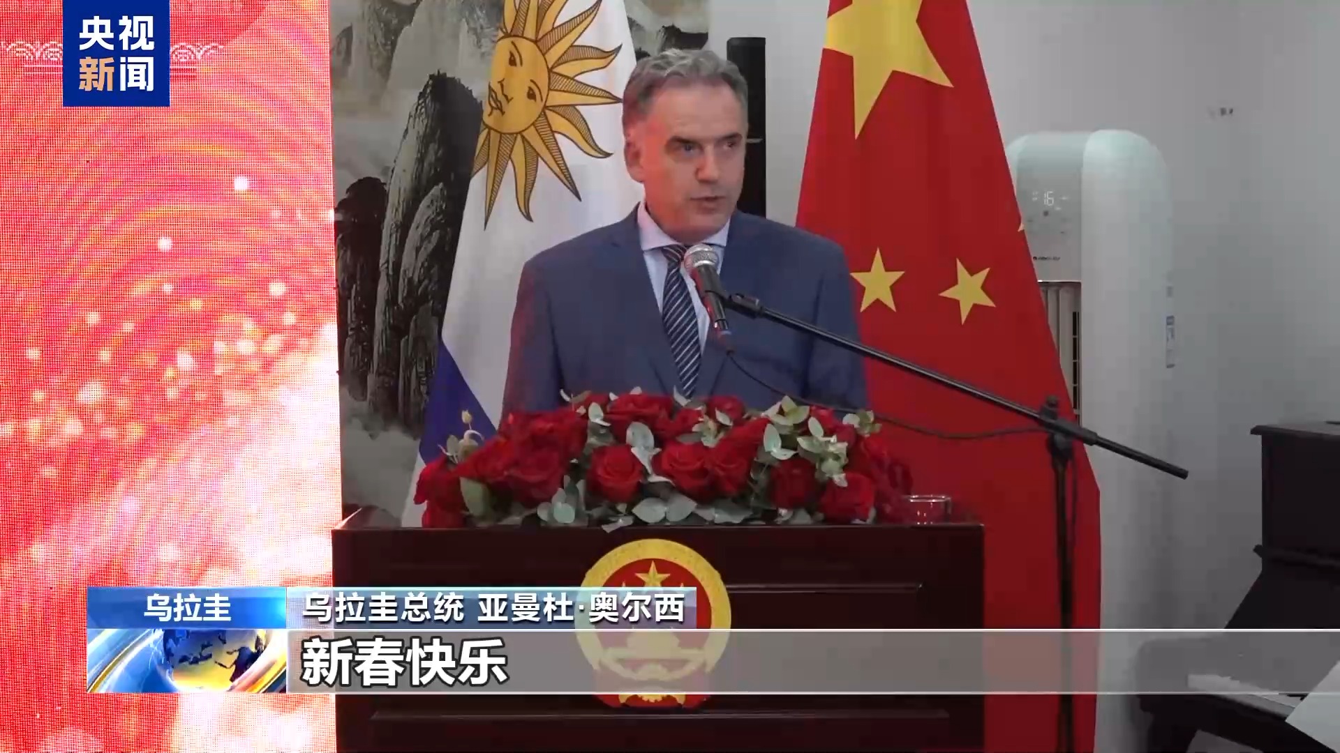 烏拉圭總統(tǒng) 亞曼杜·奧爾西:祝愿全體中國人民、全體烏拉圭人民新春快樂。非常感謝大家,祝大家新春快樂,春節(jié)快樂。