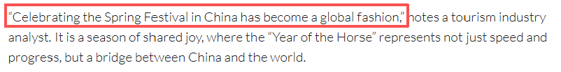 報(bào)道認(rèn)為,春節(jié)是一個(gè)共享歡樂的節(jié)日,馬年所象征的不僅是迅捷與進(jìn)步,更是一座連接中國與世界的橋梁。一位旅游分析師在報(bào)道中表示:“在中國過春節(jié)已成為一種全球時(shí)尚。”