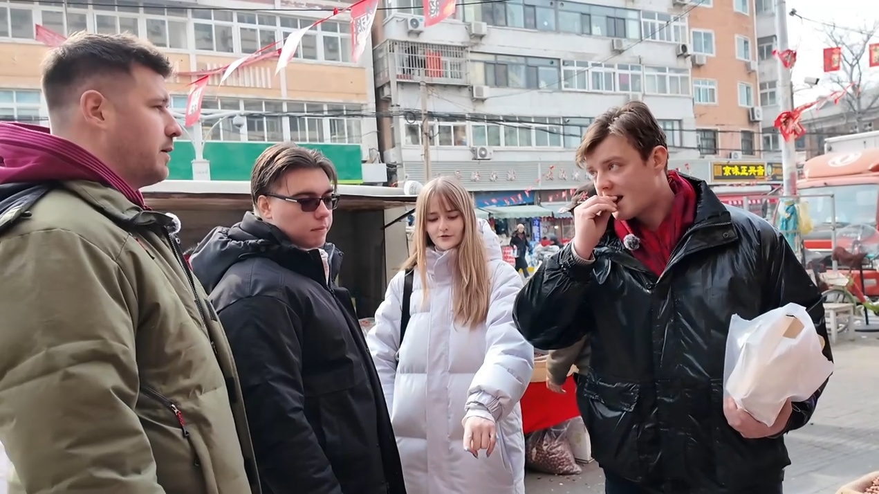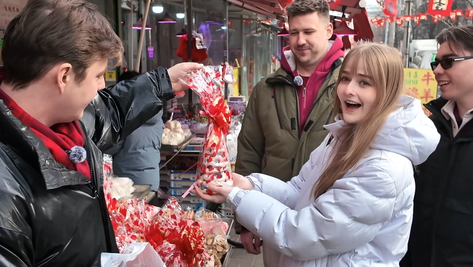 帝漢尼:我?guī)麄兂粤颂嵌諆海I了干果、瓜子。人家店鋪老板說“來嘗嘗”,我就讓他們嘗嘗。他們問“這個還能嘗嗎?”我說怎么不可以,你不嘗嘗怎么知道好吃不好吃。這些對我們來說很普通、幾乎天天都能遇到的事,對他們來說就很新鮮,嘛都新鮮。