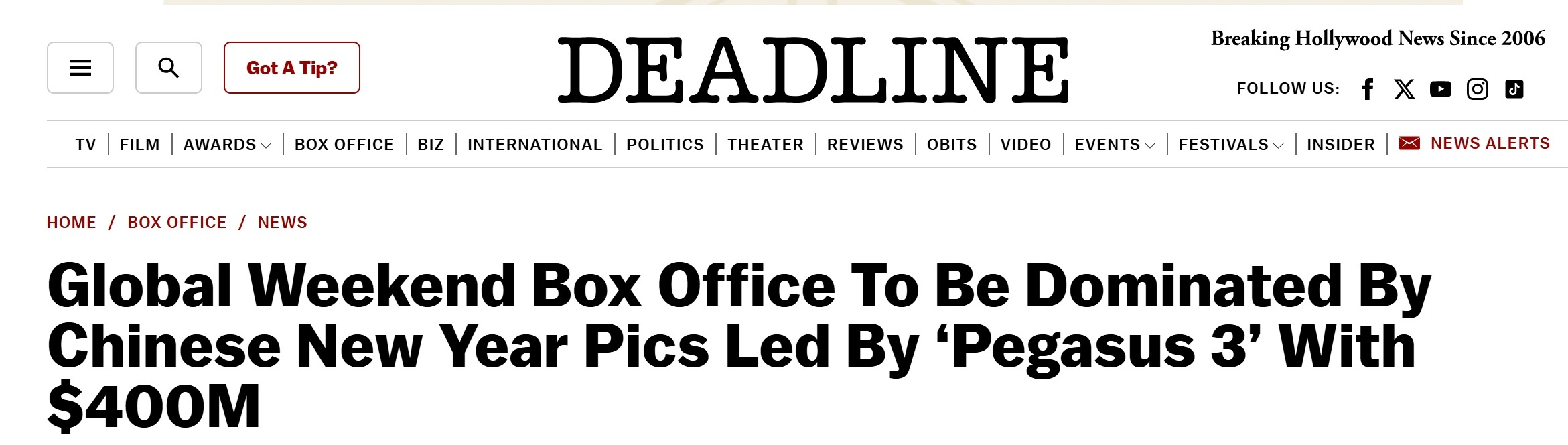 美國媒體“Deadline”網(wǎng)站報道截圖