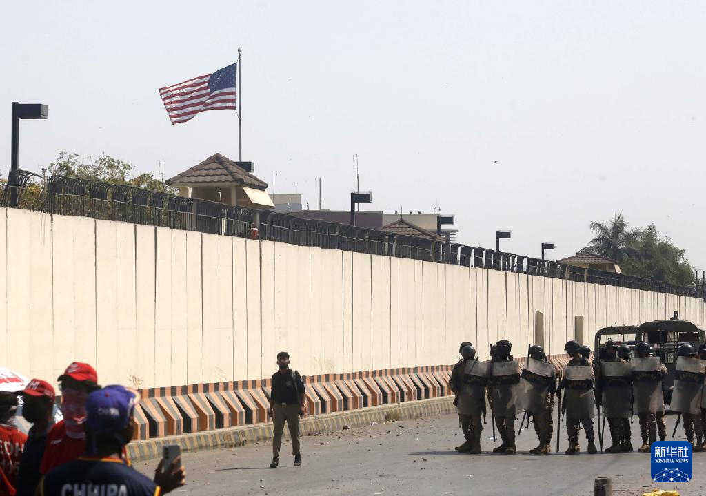 3月1日,執(zhí)法人員(畫面右側(cè))在巴基斯坦南部城市卡拉奇的美國(guó)駐卡拉奇領(lǐng)事館外控制局勢(shì)。新華社發(fā)(伊姆蘭·阿里攝)