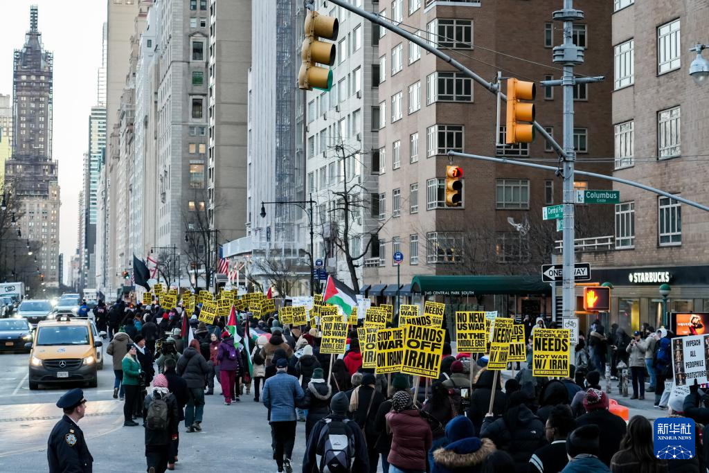 2日傍晚,數百名抗議者冒著嚴寒在紐約市哥倫布圓形廣場集會,組織方代表發(fā)表演講,人們手持標語,大聲呼喊反戰(zhàn)口號,要求“停止針對伊朗的戰(zhàn)爭”,隨后開始游行示威。