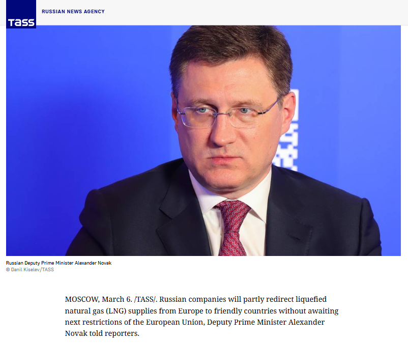 當(dāng)?shù)貢r間3月6日,俄羅斯副總理諾瓦克表示,俄羅斯企業(yè)近期將把部分供應(yīng)歐洲的液化天然氣轉(zhuǎn)向其他有需求的國家。