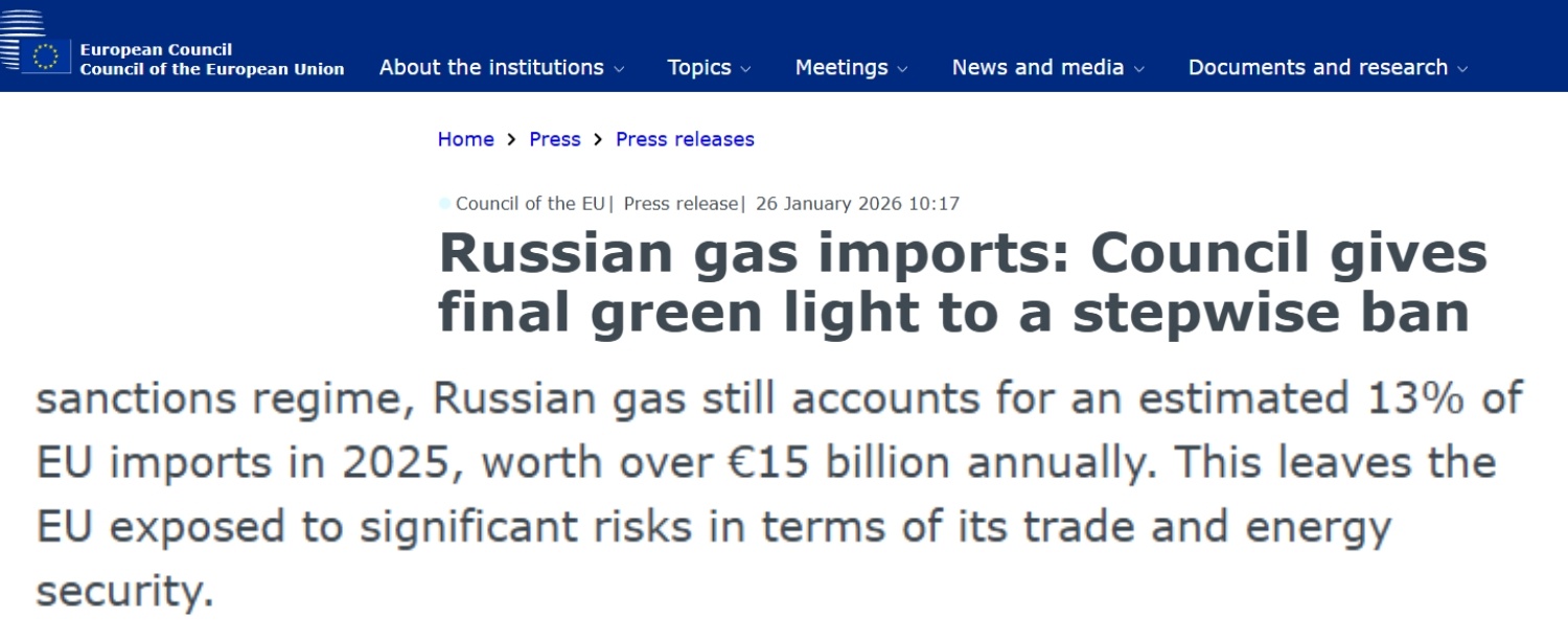 歐盟27個成員國1月26日正式通過關(guān)于逐步禁止從俄進(jìn)口管道天然氣和液化天然氣的法規(guī)。對從俄進(jìn)口液化天然氣的全面禁令將于2027年年初生效,對進(jìn)口管道天然氣的全面禁令將于2027年秋季生效。2025年,俄天然氣約占?xì)W盟進(jìn)口總量的13%,價值超過150億歐元。