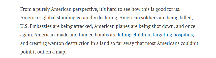 文章作者稱,(美國(guó))這場(chǎng)“無(wú)緣無(wú)故且非法的軍事行為”已將地區(qū)拖入暴力升級(jí)的漩渦,導(dǎo)致數(shù)百名無(wú)辜平民喪生。即便從美國(guó)自身利益視角看,此舉亦難言獲益——美國(guó)全球地位正迅速下降,美軍士兵不斷傷亡,使館與飛機(jī)遭襲,而美國(guó)制造或資助的炸彈仍在遙遠(yuǎn)土地上造成平民死傷與基礎(chǔ)設(shè)施破壞。
