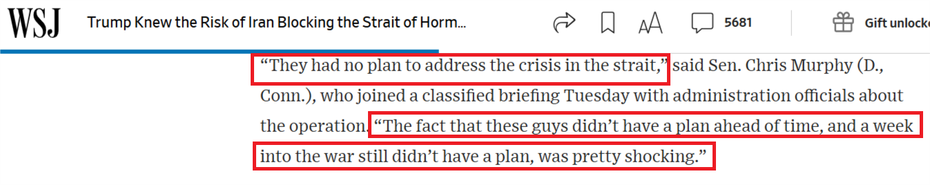 《華爾街日報(bào)》14日的報(bào)道指出,當(dāng)前霍爾木茲海峽通行受阻及由此引發(fā)的經(jīng)濟(jì)動蕩,反映出美國政府在發(fā)動軍事打擊時(shí)缺乏規(guī)劃與深思熟慮。