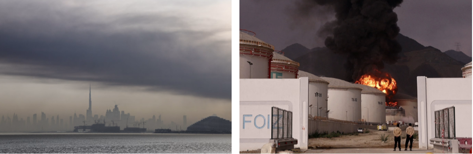 左圖:當(dāng)?shù)貢r(shí)間13日,迪拜上空冒起濃煙 右圖:阿聯(lián)酋富查伊拉一處石油工業(yè)區(qū)14日遭受襲擊發(fā)生火災(zāi) 圖源:法新社、路透社