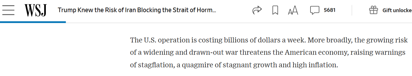 盟友之外,美國民眾也在為這場軍事行動“埋單”?!度A爾街日報(bào)》的報(bào)道稱,美國國務(wù)院直到戰(zhàn)爭開始后才敦促美國公民離開該地區(qū)國家或撤離部分大使館。而當(dāng)時(shí),商業(yè)空域已關(guān)閉,數(shù)萬美國人滯留中東,美國的外交官們在部分大使館也處于危險(xiǎn)之中;此外,美國此次軍事行動每周耗資數(shù)十億美元。戰(zhàn)爭不斷擴(kuò)大且長期延宕的風(fēng)險(xiǎn)日益加劇,正威脅著美國經(jīng)濟(jì),甚至引發(fā)“滯脹”風(fēng)險(xiǎn)。