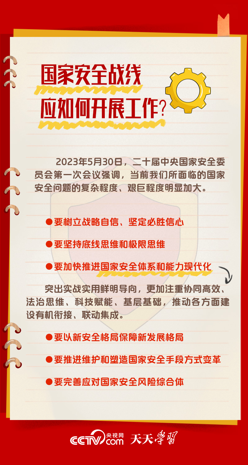 5月30日,習(xí)近平總書(shū)記主持召開(kāi)二十屆中央國(guó)家安全委員會(huì)第一次會(huì)議時(shí)強(qiáng)調(diào),要全面貫徹黨的二十大精神,深刻認(rèn)識(shí)國(guó)家安全面臨的復(fù)雜嚴(yán)峻形勢(shì),正確把握重大國(guó)家安全問(wèn)題,加快推進(jìn)國(guó)家安全體系和能力現(xiàn)代化,以新安全格局保障新發(fā)展格局,努力開(kāi)創(chuàng)國(guó)家安全工作新局面。