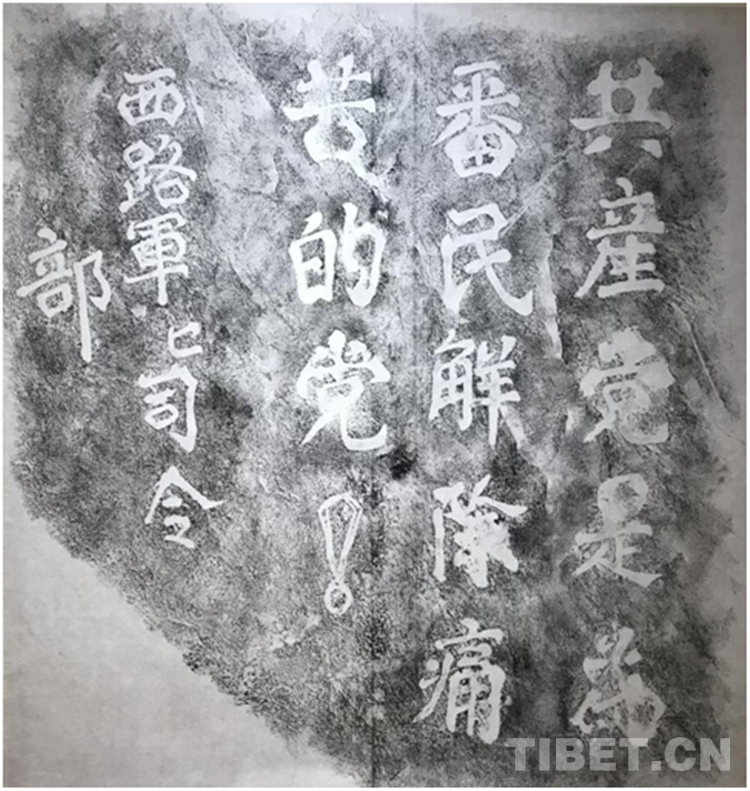 紅軍長(zhǎng)征在藏區(qū)留下了諸多遺跡,展覽中的《黑水縣沙石多鄉(xiāng)紅軍標(biāo)語(yǔ)》(1935年)便是其中一處。據(jù)歷史記載,1935年7月至1936年8月,紅一、四方面軍先后三次駐扎或經(jīng)過(guò)四川,黑水(今四川省阿壩藏族羌族自治州黑水縣)藏族群眾曾幫助紅軍熬鹽、籌糧,籌措物資。拓片中赫然醒目的標(biāo)語(yǔ)見(jiàn)證了這一段歷史:“共產(chǎn)黨是為番民解除痛苦的黨!”