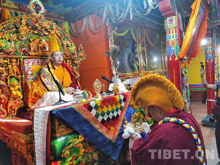 當(dāng)日的拉定寺裝飾一新,班禪一行抵達(dá)后,現(xiàn)場法號(hào)齊鳴、法螺合奏,倫珠晉巴和僧眾在寺廟前舉行了隆重的歡迎儀式。隨后,在手持香爐、寶傘高僧的引導(dǎo)護(hù)送下,班禪步入主殿上寶座,向寺廟僧眾傳授《三主要道論》,為僧眾摸頂賜福、發(fā)放布施。