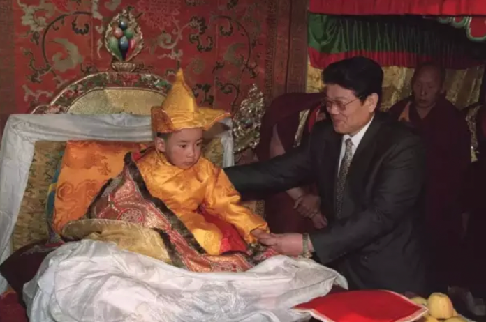 圖為第十一世班禪在國務(wù)院代表、國務(wù)委員李鐵映照護下坐床 來源:新華社