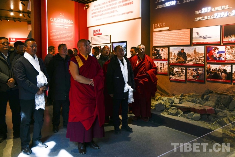 圖為第十一世班禪額爾德尼·確吉杰布在定日縣6.8級地震受災(zāi)影響最嚴重的村莊之一森嘎村村史館調(diào)研災(zāi)后重建情況 攝影:趙振宇