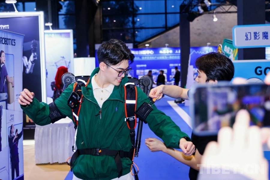 圖為游客們正在體驗?zāi)軌蜉o助提升運動表現(xiàn)的智能穿戴設(shè)備。